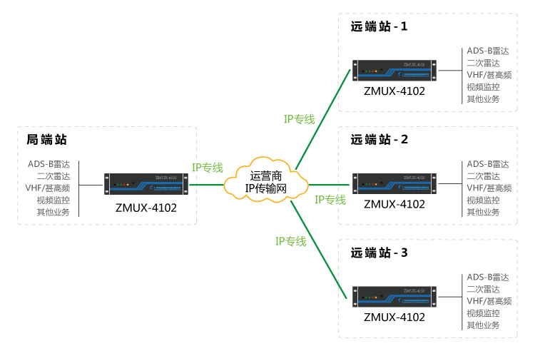 基于IP專線、光纖線路、E1 線路自動切換:遠(yuǎn)端站到局端之間,租用運營商IP專線與E1線路、光纖線路,通過接入ZMUX-4102平臺,完成IP專線與E1線、光纖線路自動切換功能,保障甚高頻、雷達(dá)數(shù)據(jù)等業(yè)務(wù)的安全可靠性傳輸。